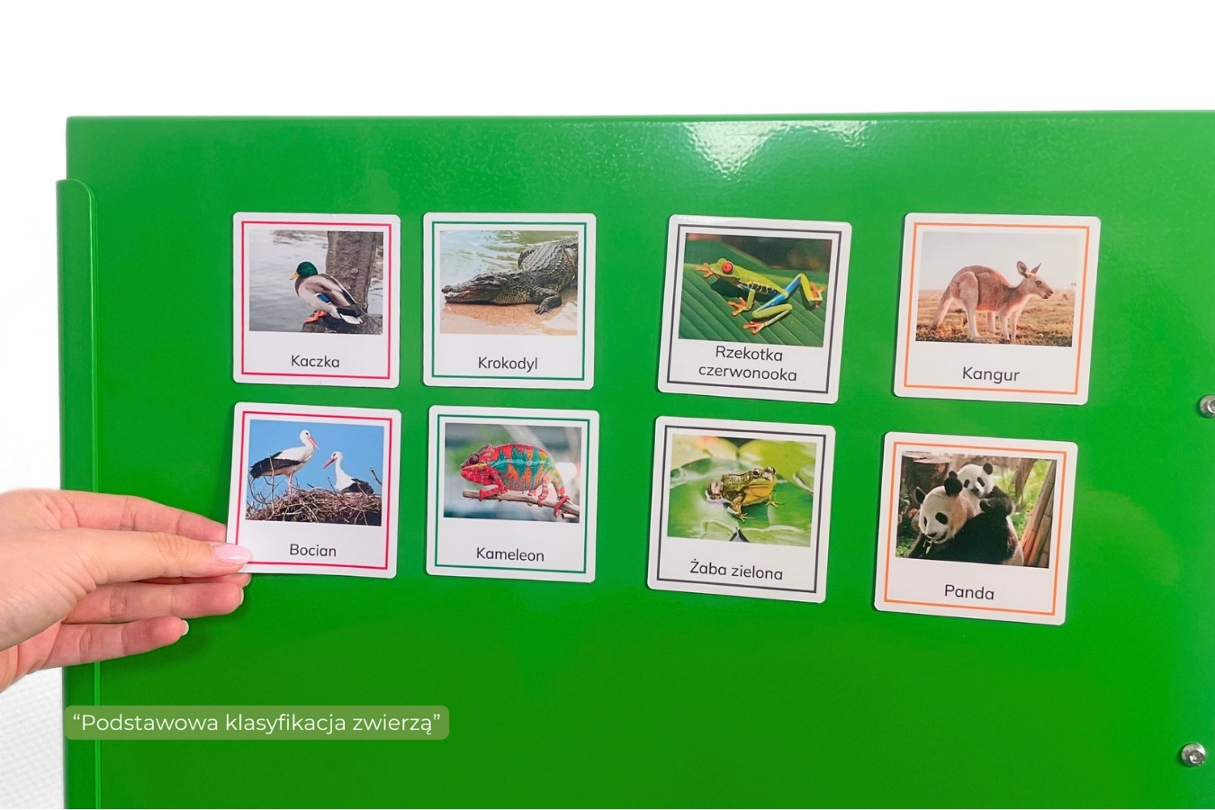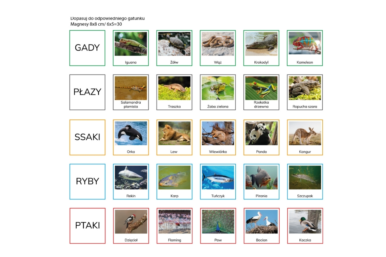 Zestaw magnesów ilustruje podział zwierząt na 5 podstawowych gromad: ssaki, ptaki, gady, płazy i ryby. Do każdej grupy przyporządkowanych jest po pięć realistycznych zdjęć przedstawicieli. Dzięki kolorowym ramkom dzieci mogą samodzielnie sprawdzać poprawność swoich odpowiedzi, zgodnie z zasadami samokontroli błędu wg metody Montessori.