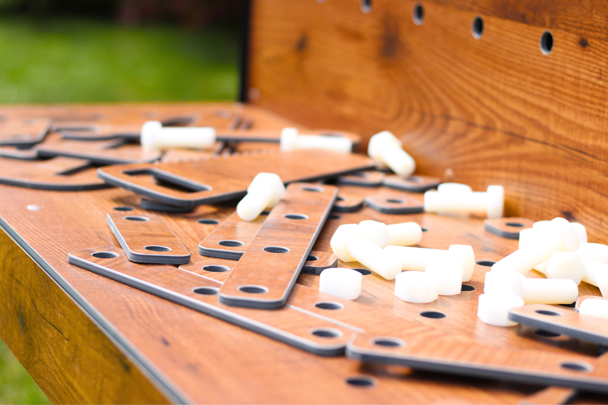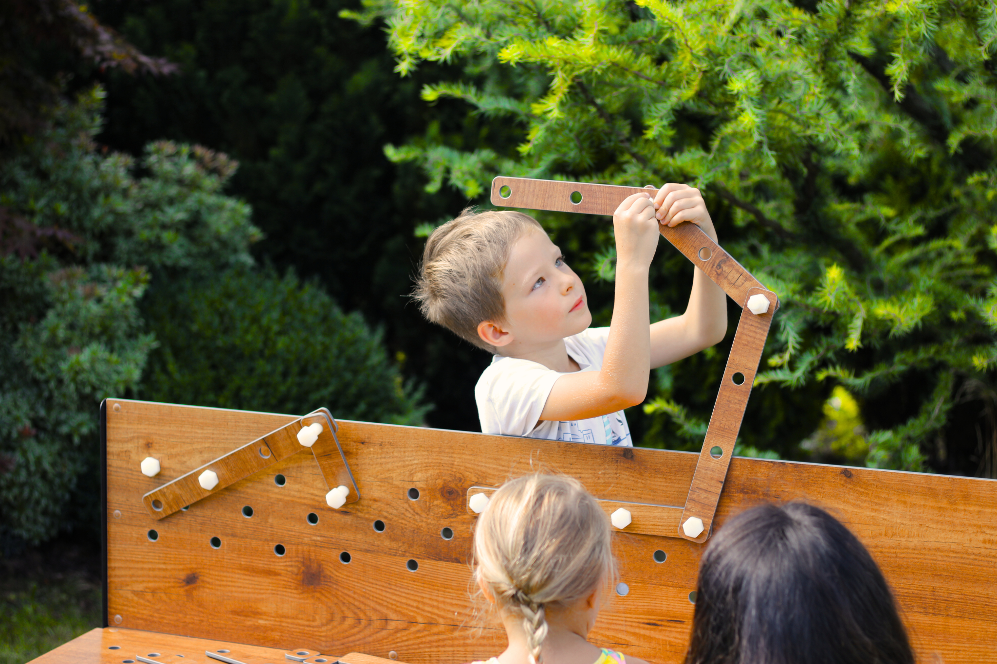 • Warsztat Eugeniusza – przestrzeń do majsterkowania i eksperymentowania. Dzieci mogą skręcać, dopasowywać elementy i tworzyć własne konstrukcje, rozwijając koordynację, precyzję ruchów oraz logiczne myślenie. To doskonałe narzędzie do nauki przez działanie i rozwijania zdolności technicznych w zabawowy sposób.