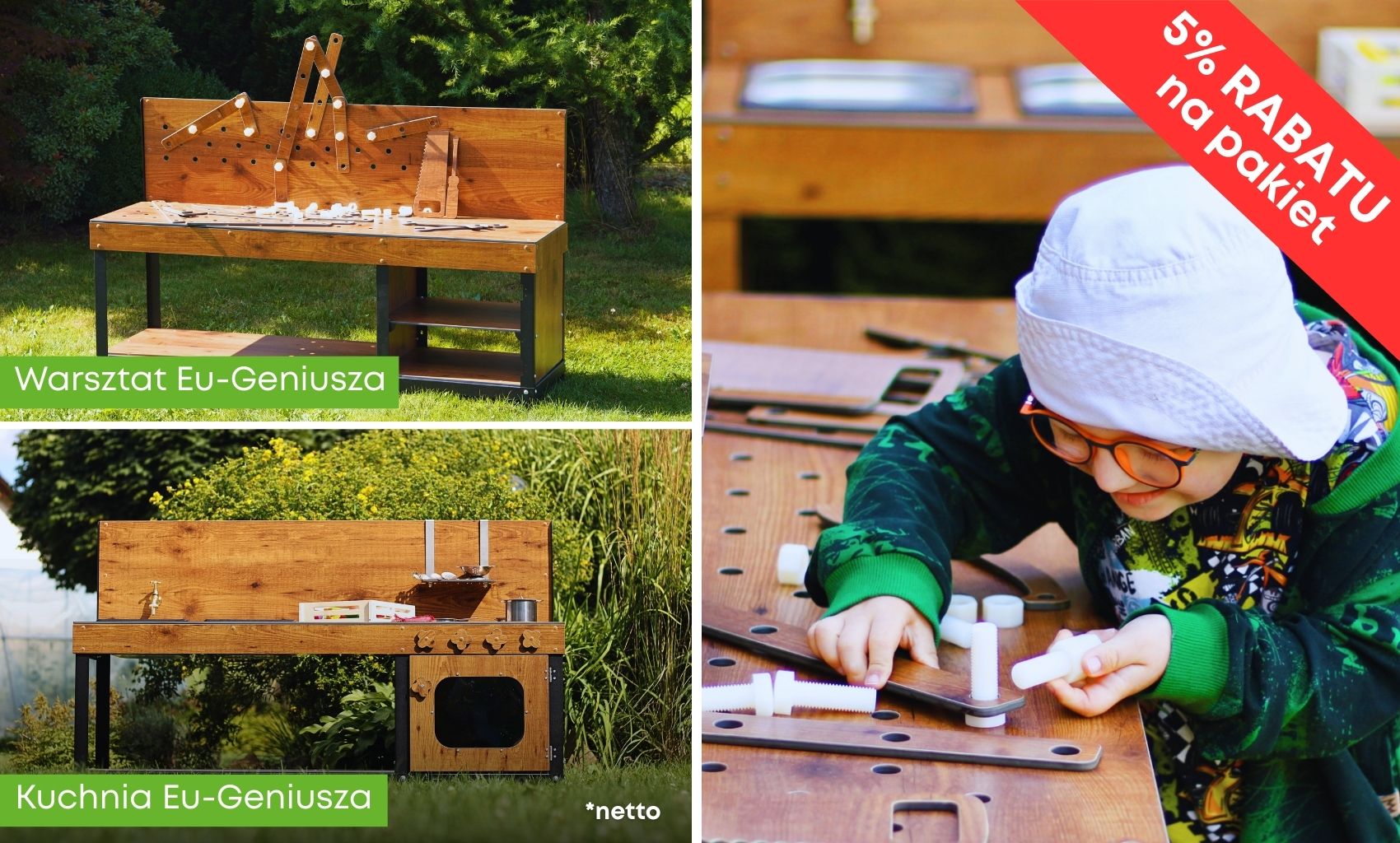 • Kuchnia Eugeniusza – rozwija zmysły i wyobraźnię poprzez zabawy w przesypywanie, mieszanie i „gotowanie” z naturalnych materiałów, takich jak piasek, woda czy kwiaty. To wyjątkowe urządzenie sensoryczne, które stymuluje dotyk, wzrok i węch, jednocześnie ucząc współpracy, samodzielności i kreatywności.