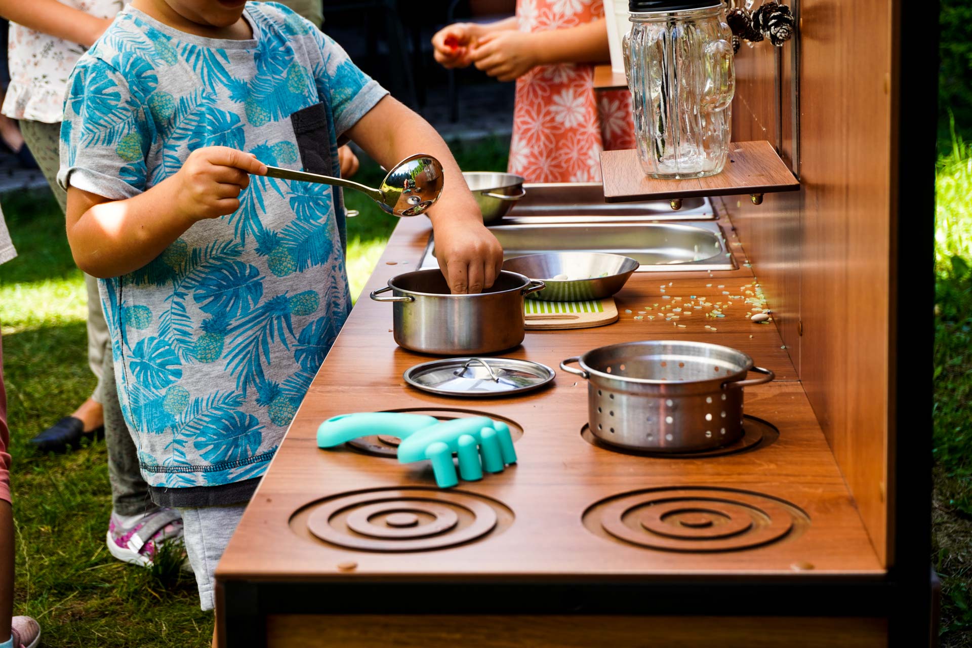• Kuchnia Eu-Geniusza – sensoryczne centrum zabawy, w którym dzieci mogą mieszać, przesypywać i „gotować” z wykorzystaniem naturalnych materiałów, rozwijając przy tym zmysły i wyobraźnię.