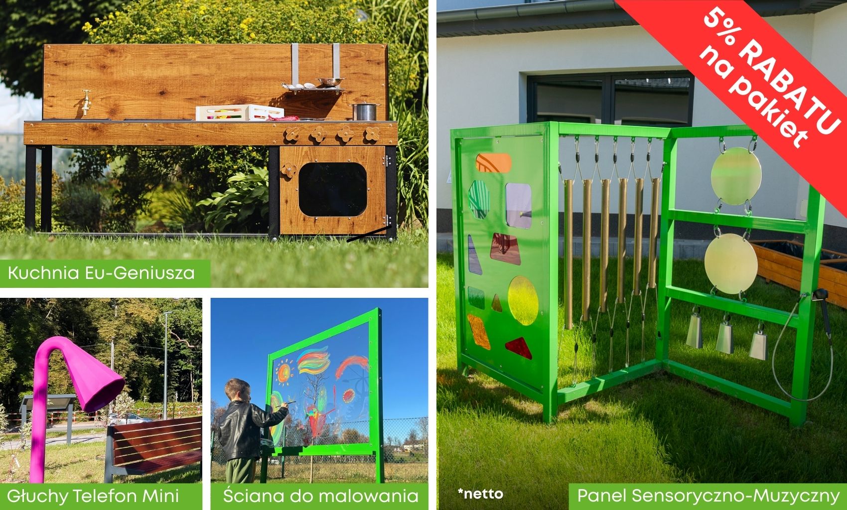 to wyjątkowy zestaw urządzeń ogrodowych, który łączy zabawę, naukę i sztukę w jedną spójną przestrzeń rozwoju. Wspiera zmysły, kreatywność i ciekawość świata, pozwalając dzieciom odkrywać dźwięki, kolory, faktury i zjawiska przyrodnicze w sposób naturalny i angażujący. To idealny wybór dla miejsc, które stawiają na wszechstronny rozwój i radość tworzenia.