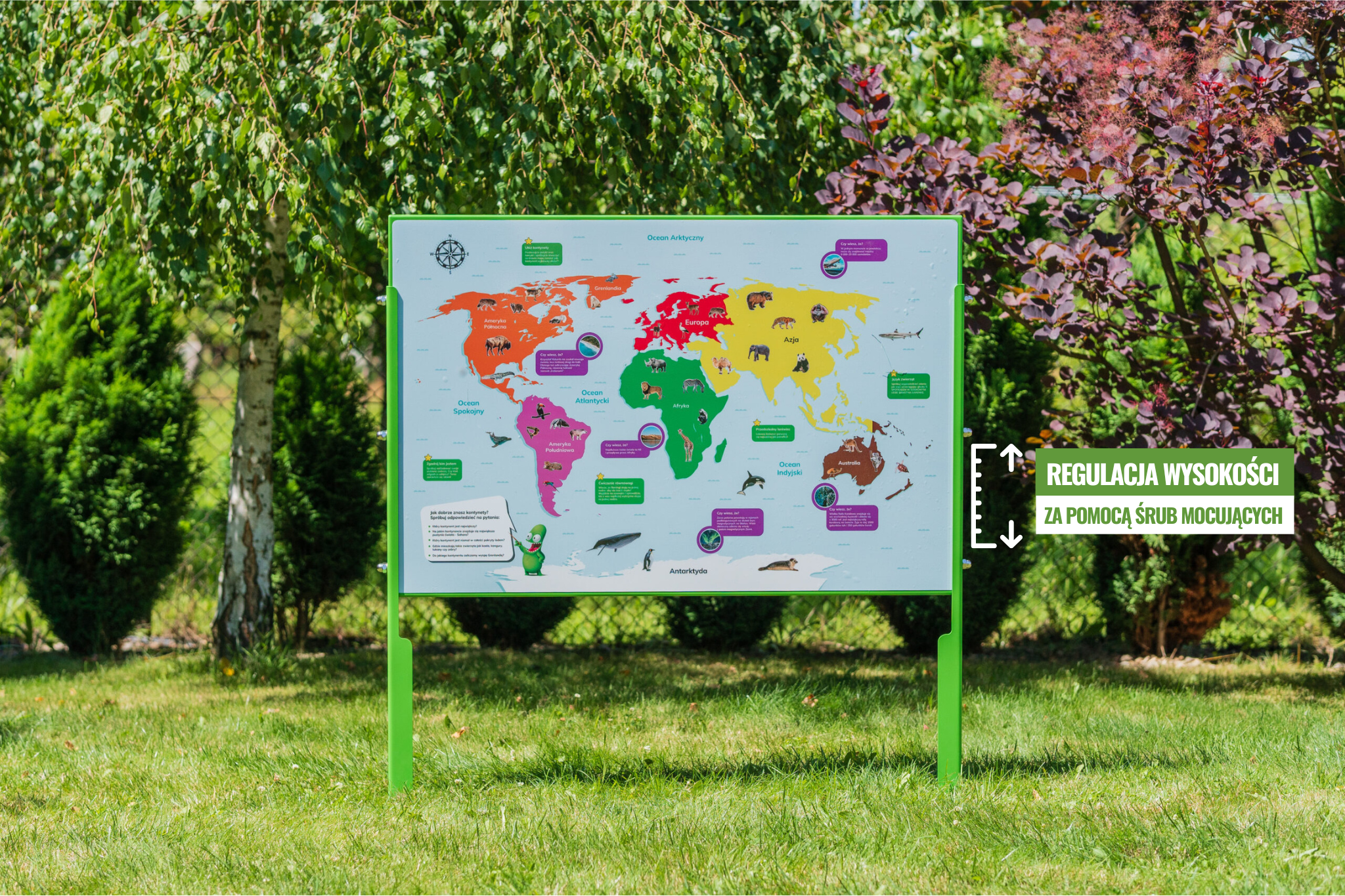 “Kontynenty” to całoroczna tablica do zabaw w ogrodzie przedszkolnym lub szkolnym. Wspiera naukę podstaw geografii, przyrody czy ekologii. Dzięki niej, dzieci z łatwością uczą się wiedzy o kontynentach, które zostały oznaczone różnymi kolorami wg zaleceń metody Marii Montessori. Zwierzęta zostały przedstawione w formie rzeczywistych zdjęć i są umieszczone w swoich środowiskach naturalnych. Na tablicy znajdują się również propozycje gier i zabaw outdoorowych oraz seria pytań dla sprawdzenia swojej wiedzy o świecie.