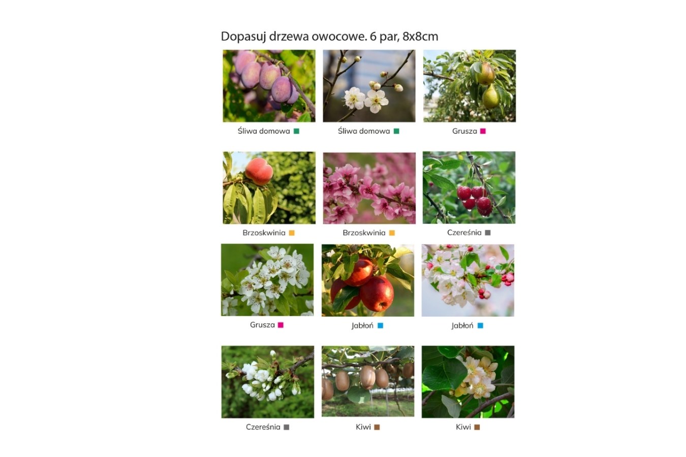 Magnesy przedstawiające drzewa owocowe oraz ich owoce. Dzieci poznają cykl wzrostu drzew, uczą się rozpoznawać gatunki oraz rozumieją zależność pór roku od owocowania.