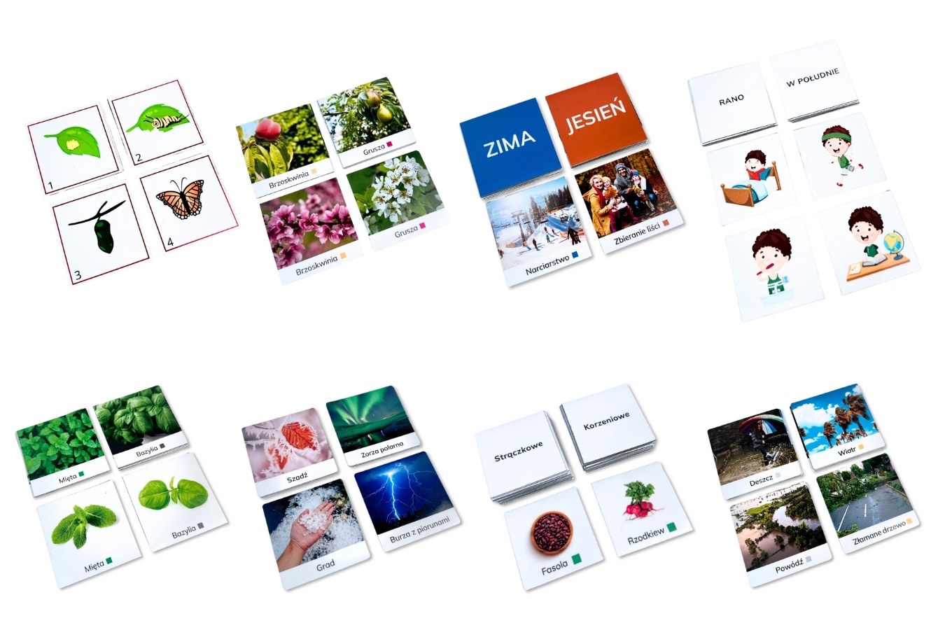 Pakiet pokazuje cztery pory roku wraz z ich charakterystycznymi cechami – zmianami w przyrodzie, pogodzie oraz codziennym życiu. To doskonałe wsparcie w nauce obserwacji cykliczności natury.