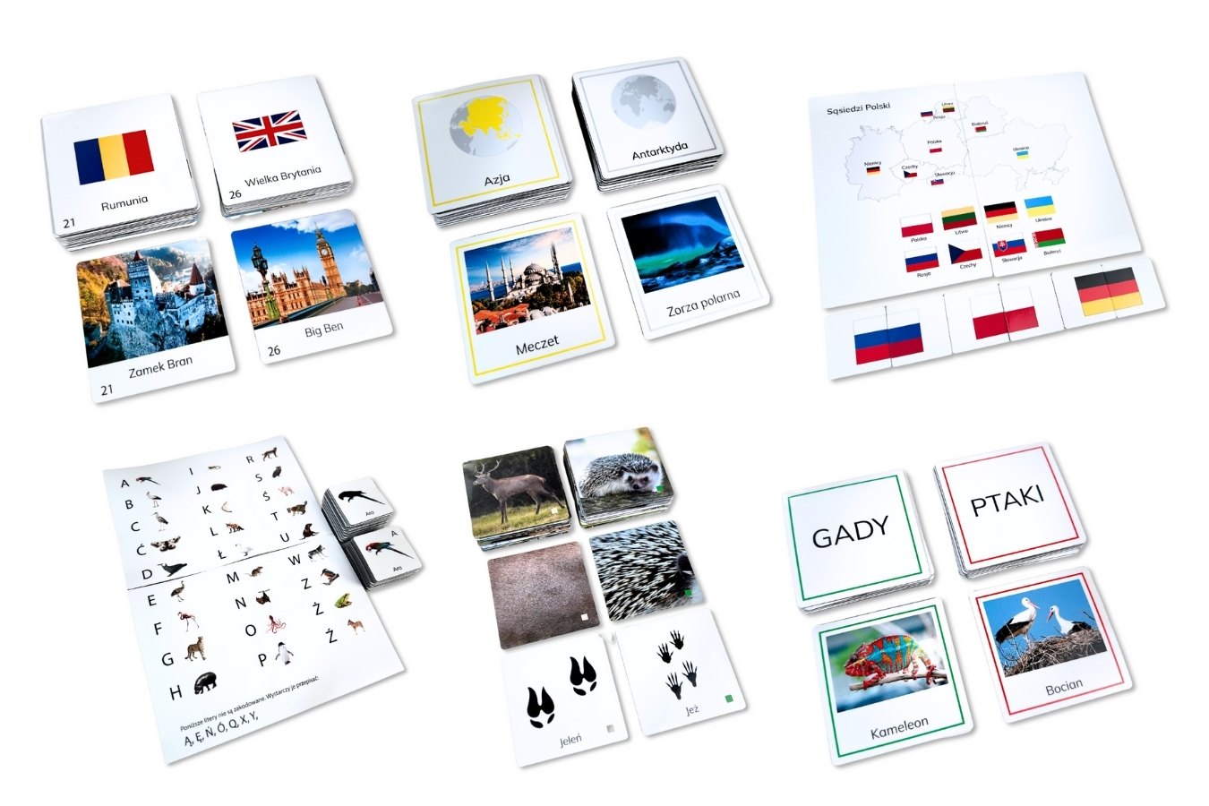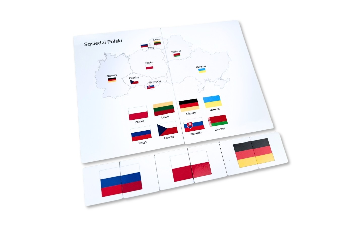Pakiet składa się z 18 magnesów i wprowadza dzieci w temat krajów graniczących z Polską. Każdy kraj łączy się z jego flagą — dzieci uczą się rozpoznawania flag i geografii lokalnej.